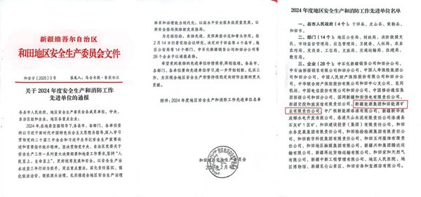 近日,和田矿业公司被和田地区安全生产委员会评为“2024年度和田地区安全生产和消防工作先进单位”。