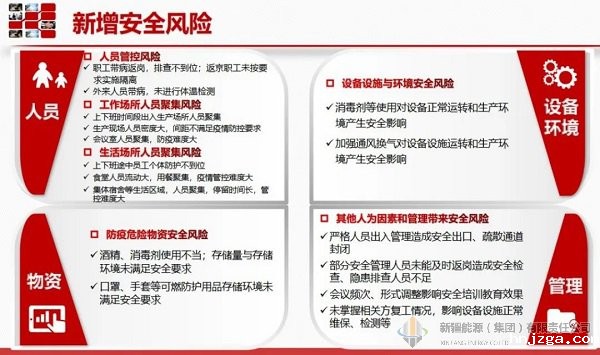 在当前疫情形势下,新增风险主要包括:人员管控风险(内部职工和外来人员);工作场所人员聚集带来的疫情传播与扩散风险;生活场所人员聚集带来的疫情传播与扩散风险;新增的防疫物资(酒精、消毒剂等)使用、储存过程中的燃烧、氧化、腐蚀等风险;生产环境变化(通风、消毒等情况)导致的风险;其他人为因素和管理带来的风险。