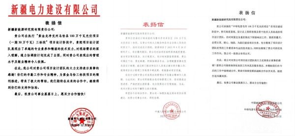 3封表扬信分别对新能源研究院在“中绿电奎屯市100万千瓦光伏项目”“乌鲁木齐米东区350万千瓦光伏项目Ⅰ标段”以及“紫金龙净克州乌恰县100万千瓦光伏项目”的咨询设计工作表示赞扬;对设计团队优秀的专业素养、过硬的技术水平、积极的反馈态度表示高度认可;对项目设计过程中一线人员勇担重任、吃苦耐劳、高效落实的精神给予高度评价;写有“值得信赖 优质高效”的锦旗更是彰显了新能源研究院“以人为本”设计服务理念。