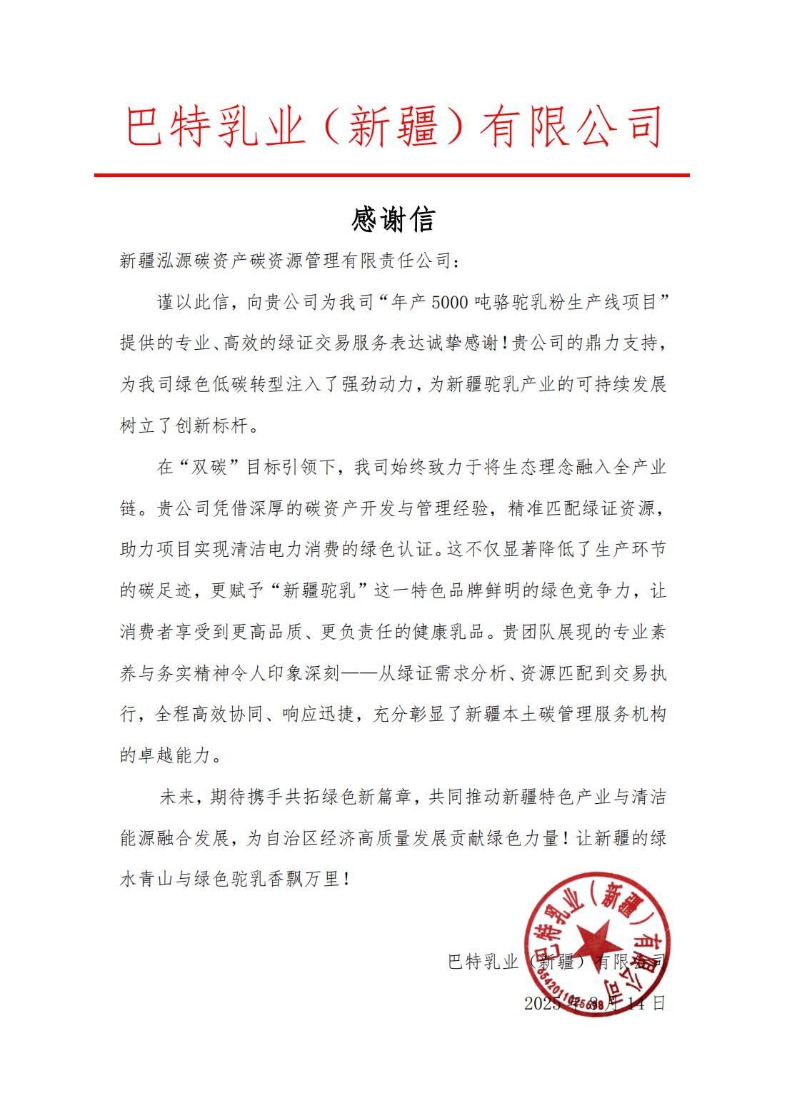 8月14日,新疆泓源碳资产收到巴特乳业(新疆)有限公司(以下简称“巴特乳业”)发来的感谢信,信中高度赞扬了新疆泓源碳资产为其年产5000吨骆驼乳粉生产线项目提供绿证交易过程中的高效服务。