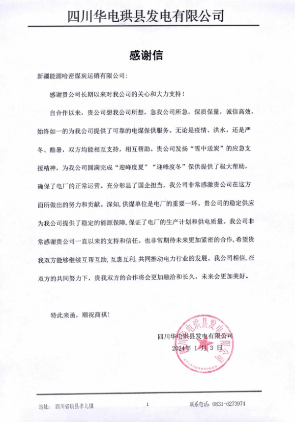 近日,哈密运销公司收到来自四川华电等多家单位的联名感谢信,对公司煤炭销售服务工作表示高度赞扬和认可。