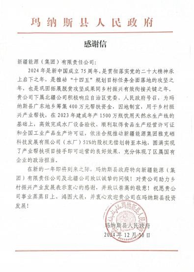 近日,集团收到玛纳斯县政府感谢信,对所属北疆公司在助力当地乡村振兴产业帮扶工作上致以感谢。