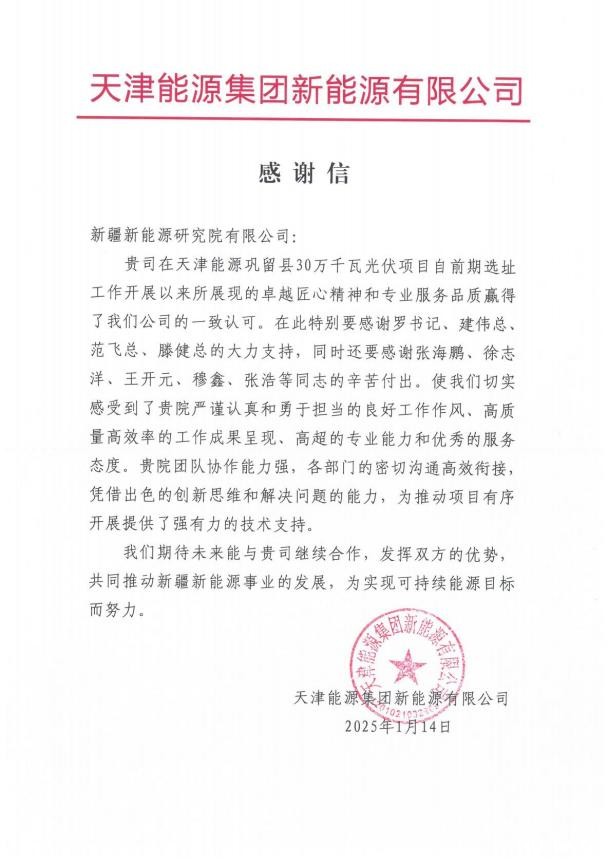 新年伊始,喜讯传来,新能源研究院收到中国建筑第二工程局有限公司、天津能源集团新能源有限公司发来的锦旗和感谢信,对上年度在项目开展中展现的卓越匠心精神和专业服务品质“点赞”,对项目勘...
