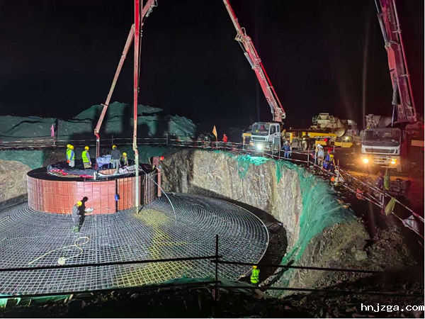 该工程位于昌吉州奇台县境内,风电场场地地貌特征为剥蚀残丘,地形地貌较为复杂,本次浇筑的风机基础为金风6.7MW机型,风机基础直径为22米,基坑深度为4.2米。为确保首台风机基础浇筑顺利完成,立新能源公司多次组织设计单位、监理单位、施工单位和设备厂家召开工程例会及专题协调会议,审核编制大体积混凝土施工专项方案,提前对参建人员进行安全技术交底,对混凝土浇筑、养护等细节进行周密安排,并多次考察商砼站,确保混凝土供应及时可靠,安排专人专责进行逐一核查,严格执行相关技术方案与施工标准,严把施工质量,梳理安全隐患,避免了施工过程中可能出现的隐患或不利影响。在经过12个小时的连续作业后,814方混凝土成功入模,进而转入首台风机基础大体积混凝土浇筑收光作业。