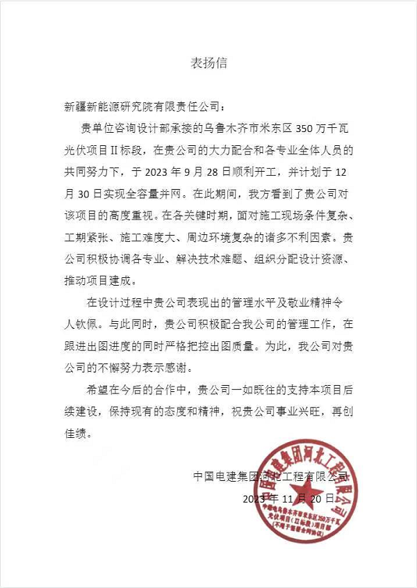 近日,新能源研究院收到中国电建集团河北工程有限公司发来的表扬信,信中对新能源研究院圆满完成乌鲁木齐市米东区350万千瓦光伏项目Ⅱ标段咨询设计任务表示高度肯定和感谢。